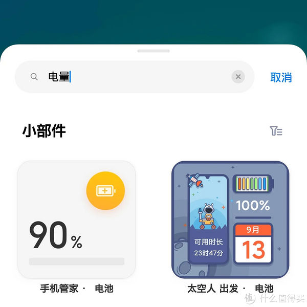 打开MIUI 13的小部件,然后在搜索框里面,输入关键词【电量】即可。