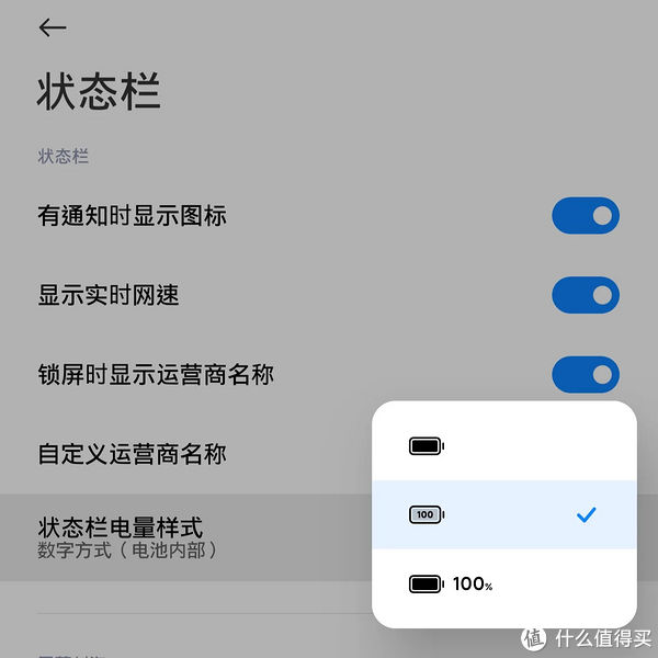 在MIUI系统状态栏,将电量样式选择开启,默认支持2种数字显示样式,一种为0-100的纯数字显示,1种为0%-100%的百分比显示。