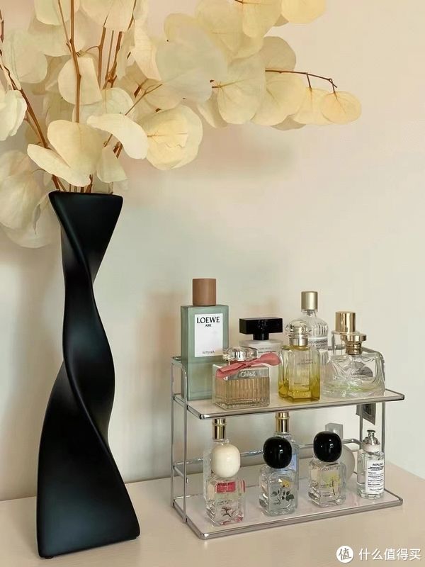 有一次在实体店,我看到这个双层置物架了,颜值很高,跟普通商品的区别是,后边还有一张摆满香水的置物参考图。